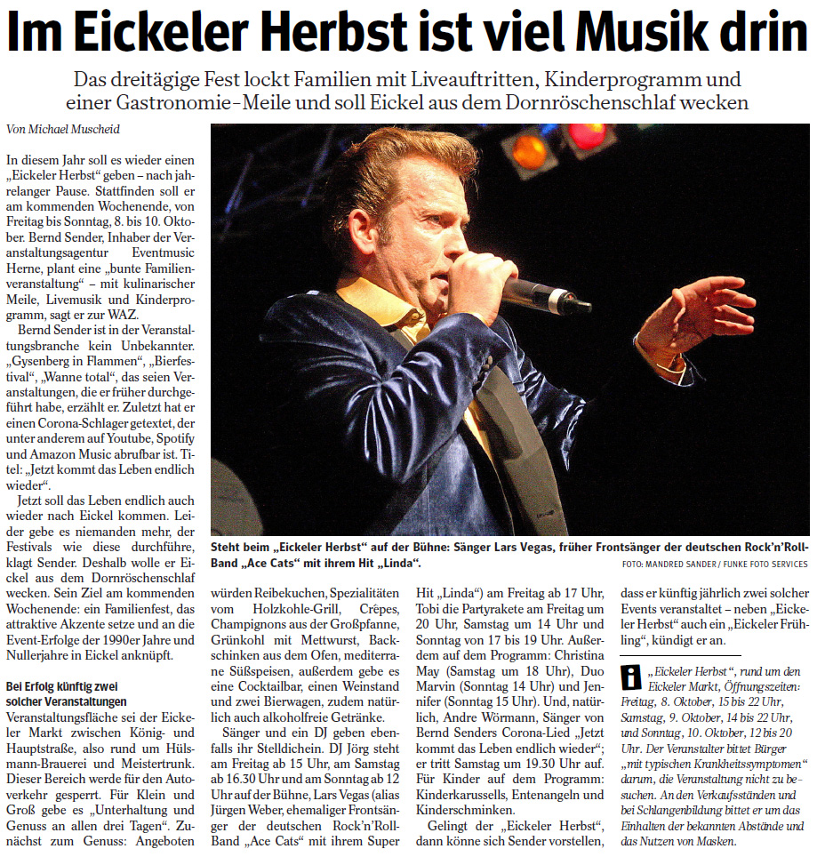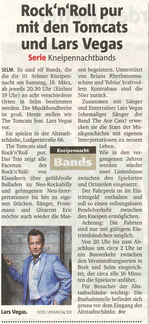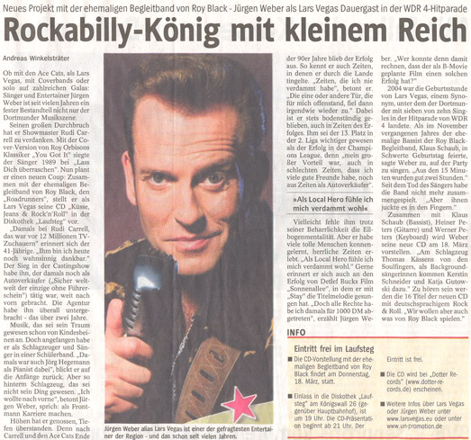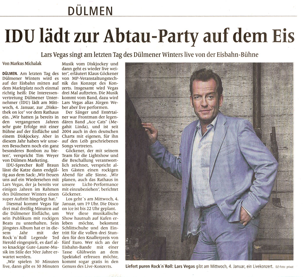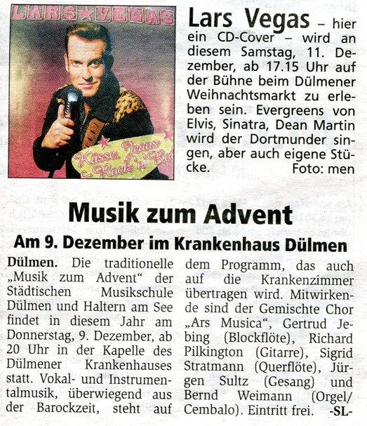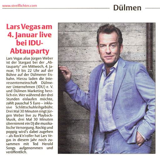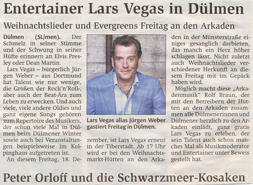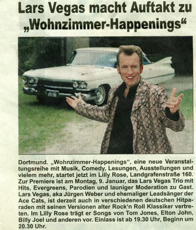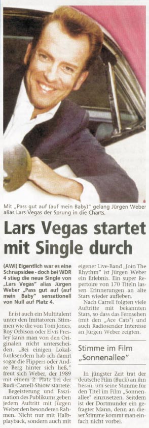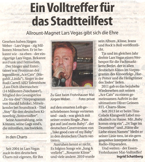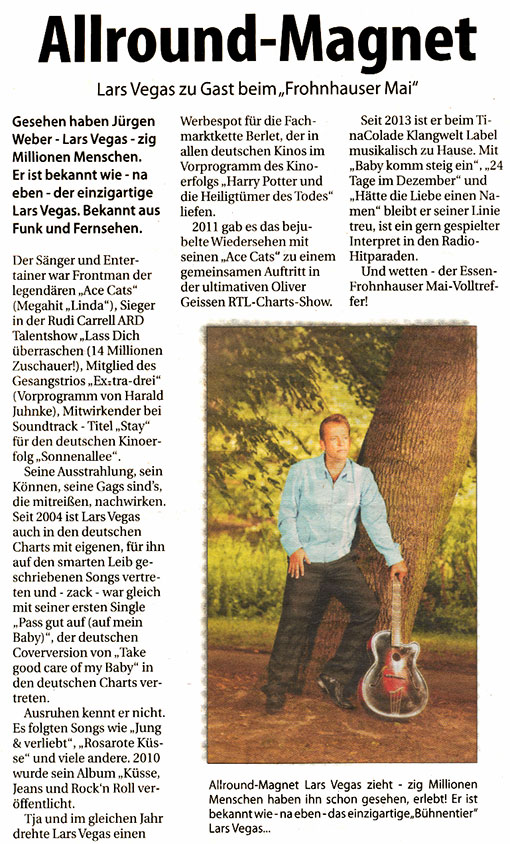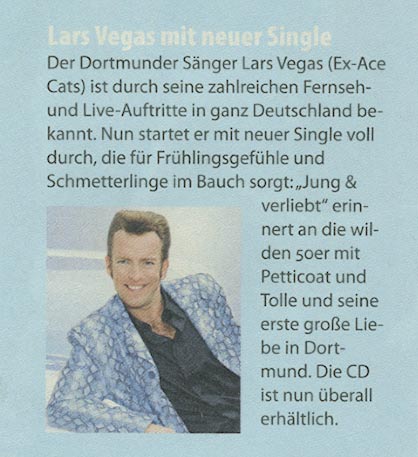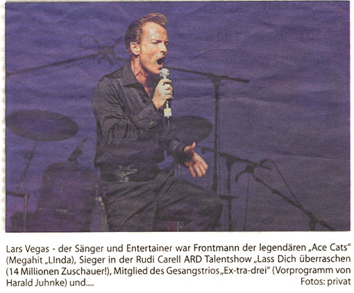 Lars Vegas steht in der deutschen Entertainment Szene für Unterhaltung der Extraklasse. Der Sänger und Entertainer war Frontman der „Ace Cats“ (Megahit „Linda“), Sieger in der legendären Rudi Carrell Talentshow „Lass Dich überraschen“ mit 14 Millionen Zuschauern. Er war auch Mitglied des Gesangstrios „Ex-tra-drei“ im Vorprogramm von Harald Juhnke und Sänger der WDR 4-Band auf zahlreichen Stadtfesten und Events. 2010 erschien sein Album "Küsse, Jeans und Rock´n´Roll" mit den Radiohits „Pass gut auf auf mein Baby", „Rosarote Küsse“ und "Du bist kälter noch als Eis". Später gab es ein Wiedersehen mit seinen „Ace Cats“ zu einem gemeinsamen Auftritt in der ultimativen Oliver Geissen RTL-Chartshow. Nun meldet er sich 2021 zurück mit dem originellen Titel "Baby, tanz mit mir". VÖ am 3. Februar 2021auf „a la tete records“.